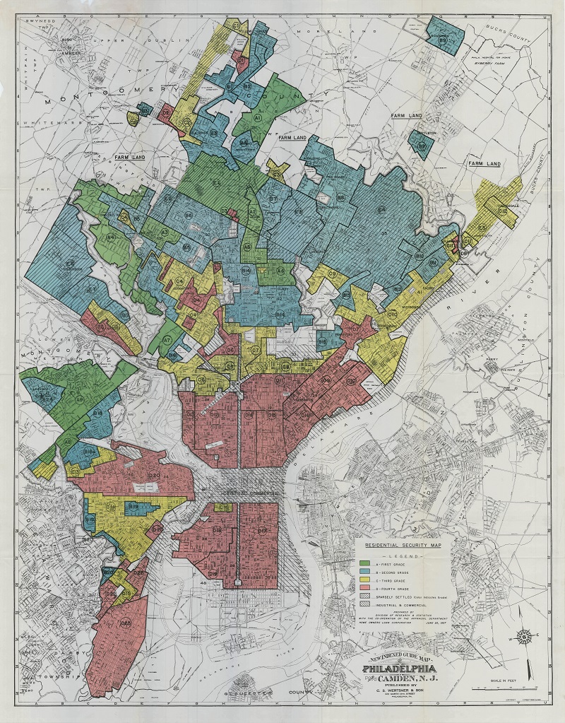 The redlined neighborhoods included sections of West Philadelphia and South Philadelphia, as well as areas near downtown. These were neighborhoods where few mortgage loans were distributed by financial and lending institutions and where the black population was significantly higher.