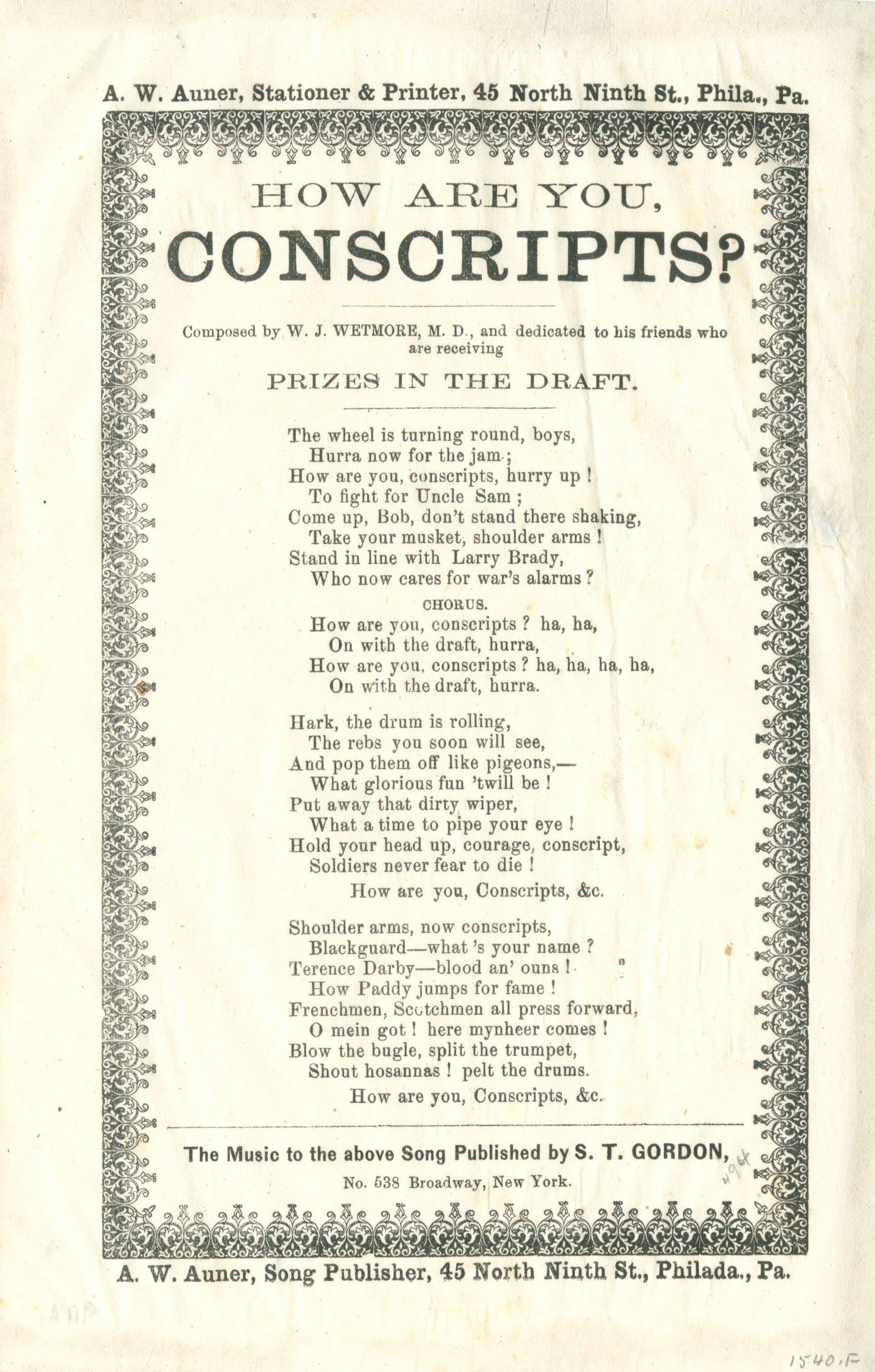 “The wheel is turning round, boys,” this song calls out to Philadelphia’s potential draftees. “Hark the drum is rolling, the rebs you soon will see.” (Library Company of Philadelphia)