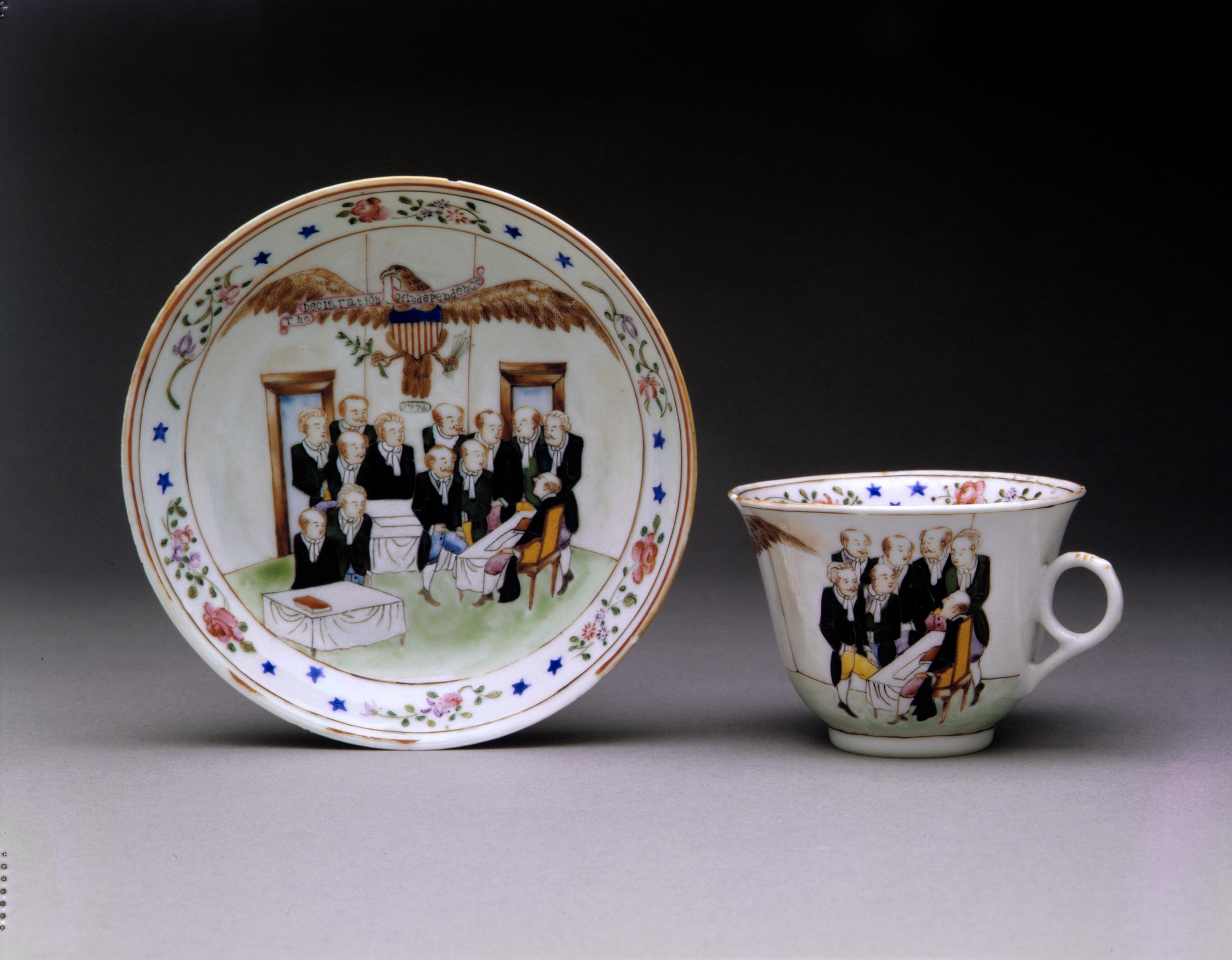 Approximately seventy-five pieces similar in decoration to this teacup are in the collections of American museums. The miscellany of dishes includes cups, saucers, small pitchers, and at least one tureen, and it is believed that the pieces were created independently of one another. That is, there was never a set of Declaration of Independence porcelain. The highest concentration of Chinese porcelain bearing this design is held by the Winterthur Museum near Wilmington, Delaware, and was purchased by Henry Francis du Pont (1880-1969) in 1948 from Dr. James McClure Henry (1880-1958), a Presbyterian missionary. Henry had procured them from a single dealer in Canton (Guangzhou), China between 1939 and 1947.