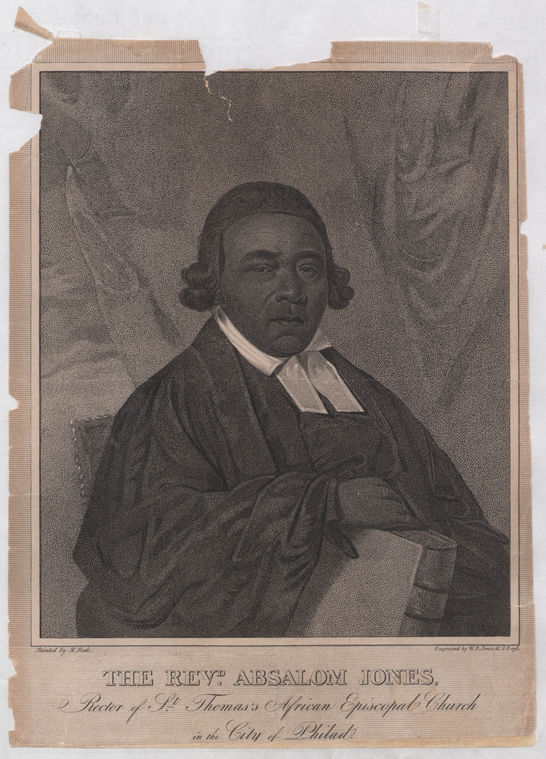 Born enslaved in Delaware in 1746, Absalom Jones purchased his freedom in Philadelphia at the age of thirty-eight. He then dedicated his life to developing and promoting the free black community in Philadelphia. In addition to helping to establish the Free African Society and St. Thomas African Episcopal Church, Jones advocated for Black education reform and ran a school for Black children in his home. The African Episcopal Church of St. Thomas, founded in 1794, quickly became an important parish for Black Episcopalians. Bishop William White ordained Jones as a deacon but refused to promote him to the priesthood for another decade, and Jones was never invited to attend the annual conventions of the diocese.