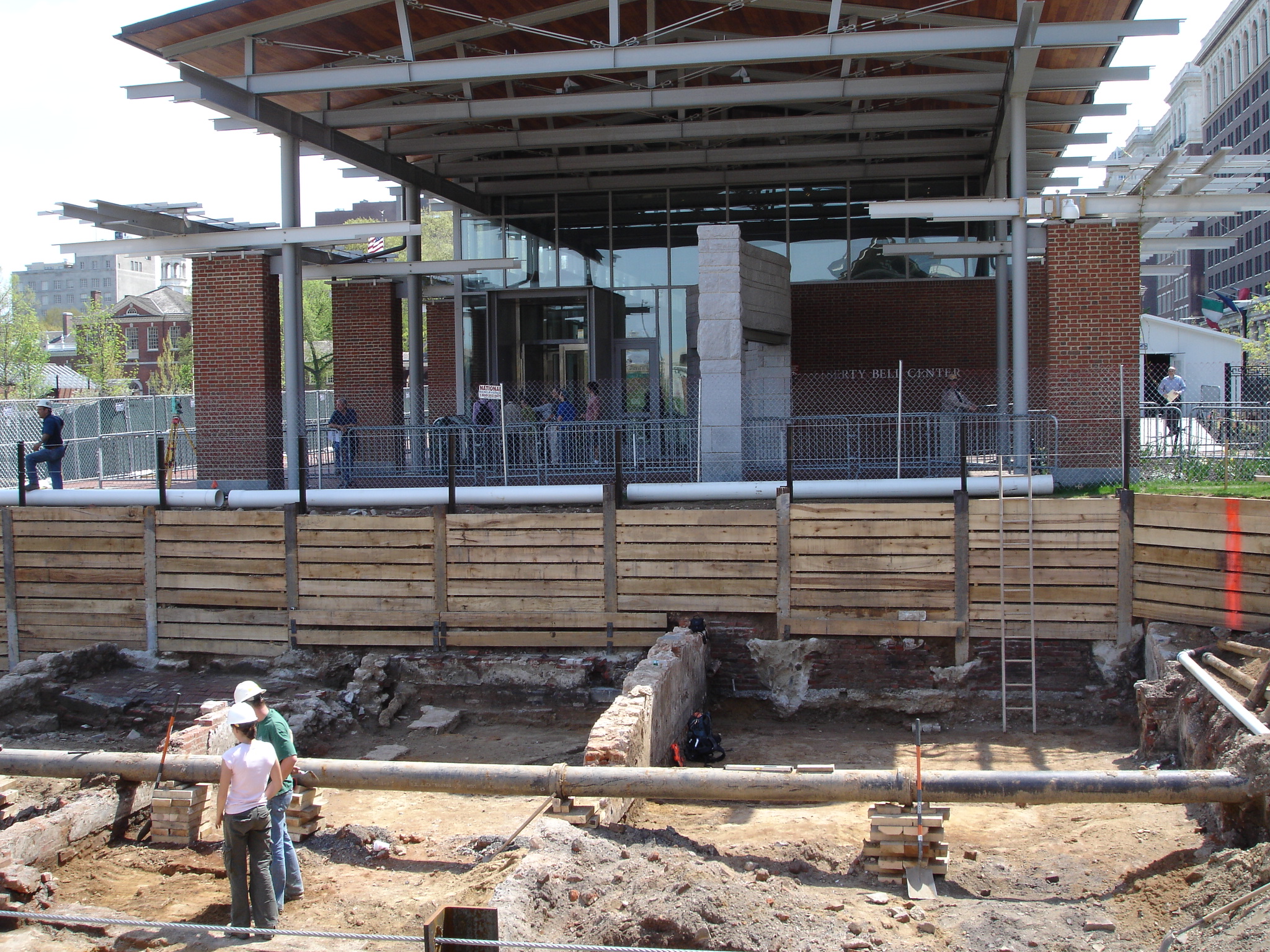 Additional changes resulted from local activism. In 2002, an article in Pennsylvania Magazine of History and Biography written by Edward Lawler Jr., a member of the Independence Hall Association, called attention to the history of the long-demolished President’s House and its site at Sixth and Market Streets near the planned Liberty Bell Center. Park management initially resisted the Independence Hall Association’s call to mark the footprint of this site of the Executive Branch under George Washington and John Adams, but Lawler’s article aroused public interest in the presence of slavery in Washington’s household.