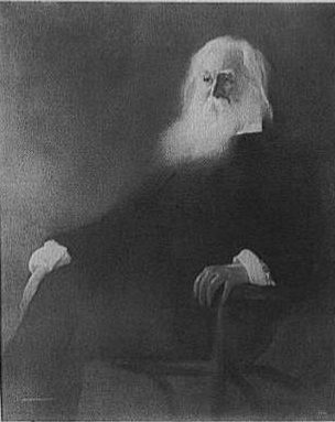 a black and white photograph of Walt Whitman as an elderly man. He sits in a chair with legs crossed.