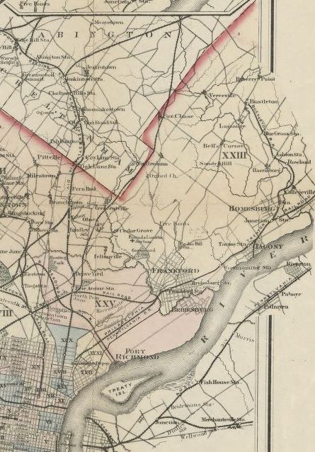 Other settlements, primarily centered on farming and mill activity, dotted Northeast Philadelphia’s rural terrain and creek beds prior to and following the Consolidation Act of 1854, with pockets of gilded affluence appearing sporadically along the Delaware River in the late nineteenth century. Multiple townships throughout the Northeast possessed small, farming enclaves and communities, especially Bustleton, Somerton, and Fox Chase. In the early 1850s, residents from the Northeast decried the city’s plan to annex their communities into a newly consolidated city-county governance authority, which aimed to confer municipal services and policing functions on outlying suburbs in exchange for jurisdictional control over their neighborhoods. Some Bustleton residents, afraid of losing their independence, resisted the city’s annexation plan by initiating legislation, which ultimately failed, to thwart the proposal. While the Northeast remained predominantly rural following the Act of Incorporation’s passage, some of Philadelphia’s well-heeled elite erected palatial mansions and estates in Holmesburg and Torresdale, with the most notable Victorian structure being the opulent Glen Foerd mansion, which still overlooks the Delaware River, in Torresdale.