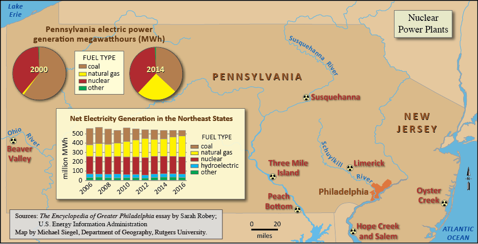 From the time plans began in the late 1950s, nuclear power production in Greater Philadelphia was controversial. For decades, residents, politicians, and businesses struggled to balance economic motivations and energy demands with concerns about public safety and environmental risk. In 2017, nuclear production facilities generated over one-third of the electricity for both Pennsylvania and New Jersey, with nearly all of the plants located within one hundred miles of Philadelphia and in close proximity to millions of residents. The extreme tension between public safety and public benefits came to define the nuclear power industry in the region.