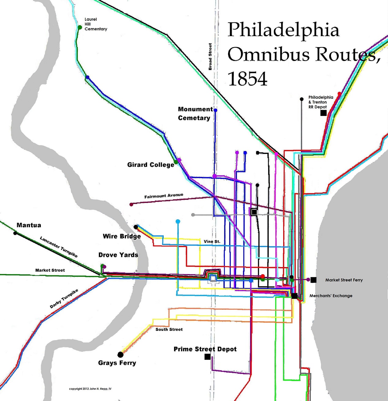 By 1830, the population of the city and its adjoining suburbs in the county was well in excess of 130,000 and it was the second largest metropolitan area in the country after New York. As the population expanded northward, westward and southward from the city’s original center along the Delaware River at Market Street, entrepreneurs imported the concept of the omnibus from Paris (where it originated in 1819 and the name was coined in 1828), New York (1827) and London (1829). James Boxall opened the first route in December 1831 on Chestnut Street between Second Street and Schuylkill Seventh Street (modern Sixteenth Street). The service operated hourly and charged a fare of ten cents. From this modest start, omnibus service quickly expanded throughout the city and its immediately adjoining suburbs. By the late 1850s over three hundred omnibuses operated over dozens of routes on a regular basis. While fares remained high on many routes (commonly ten or twelve cents), some shorter routes charged lower fares (as little as three cents per trip) and most lines offered annual “subscriptions” (or season tickets) to regular commuters.