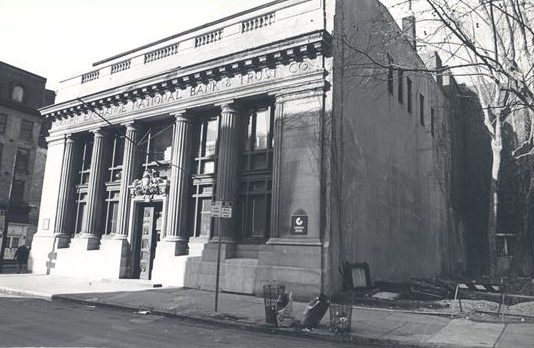 a black and white photograph of a bank built in the classical style with prominent front columns