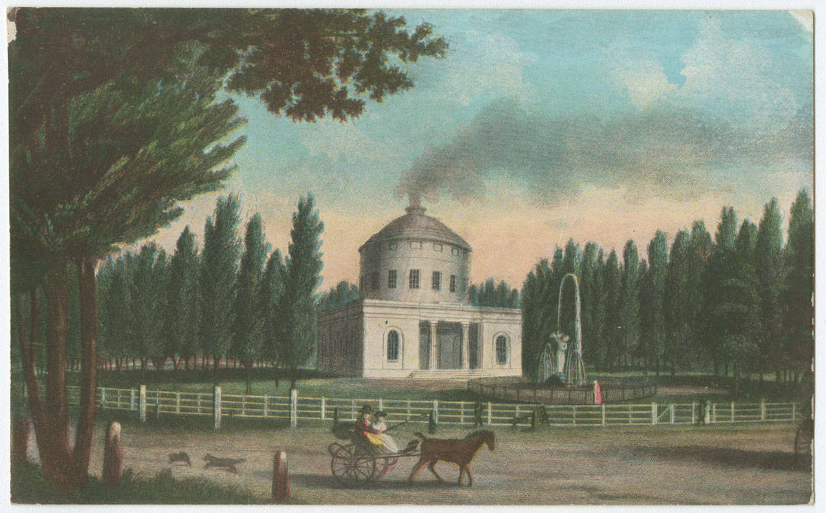 Several squares in Philadelphia became defined by their distinctive trees. Tall Lombardy poplars lined the pathways of Centre Square, the location of a neoclassical Engine House powering the city’s first Waterworks and, later, the site of City Hall. First brought to the United States from Europe in the 1780s by William Hamilton (1745-1813), the proprietor of the Woodlands estate outside the city, Lombardy poplars became extremely popular throughout the Northeast because they quickly grew to great heights and were easily transplanted. Many American cities planted Lombardy poplars after 1799, the year of George Washington’s death, because they were believed to be the first president’s favorite tree. Washington Square served as an arboretum to educate the public about horticulture. By 1831, the square contained fifty varieties of North American and European trees, two of which were introduced by Meriwether Lewis and William Clark from their 1804-06 expedition in the Rocky Mountains.