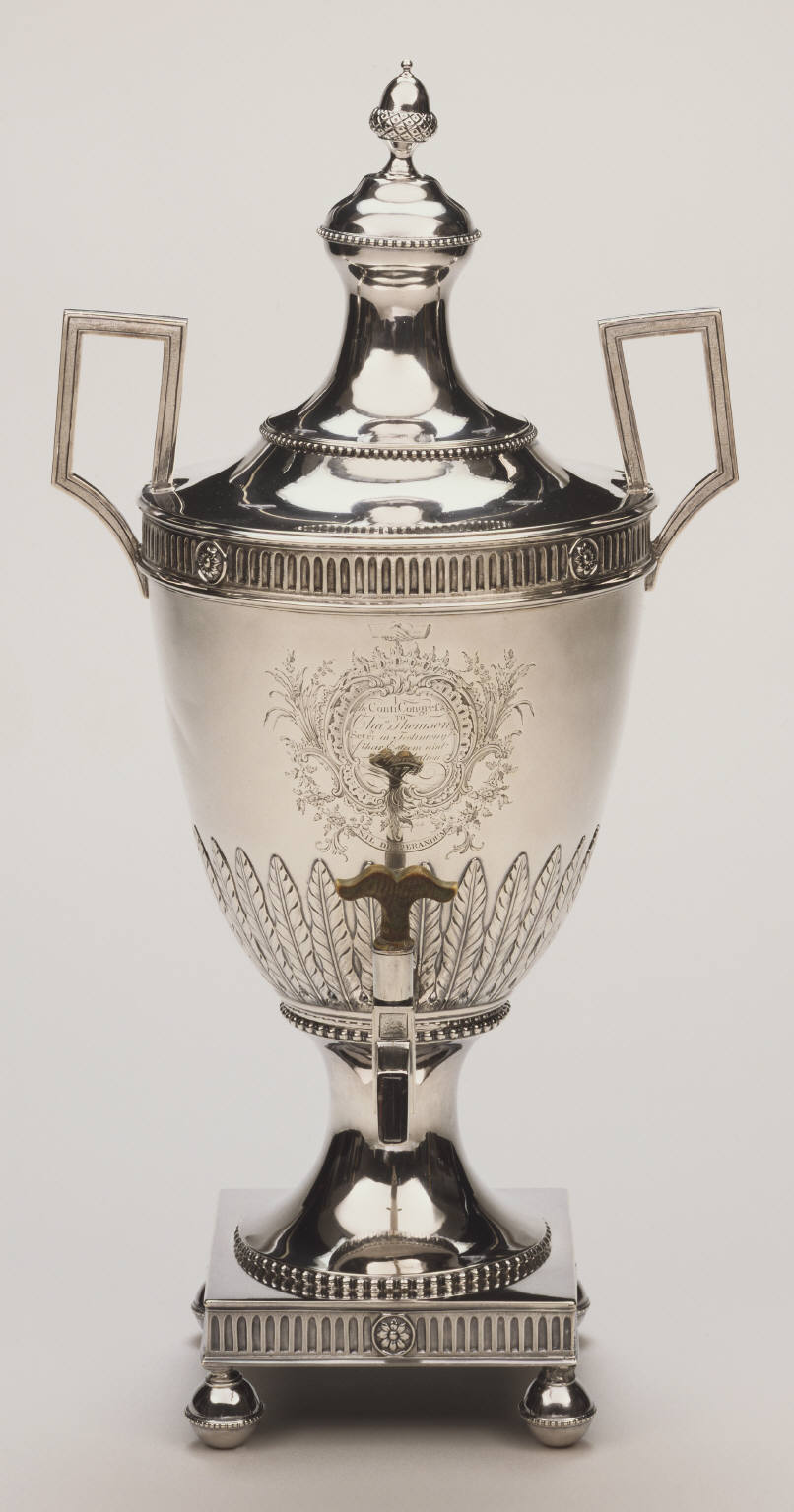 The design of furniture, fabrics, upholstery, silver, and ceramics followed architecture’s classicizing trend. Where furniture once had voluptuous carving, there was low relief carving and colorful wood inlays of vases, urns, and intricate geometric patterns. Chairs had backs in the shape of vases and by 1805 wholly imitated antique Greek Klismos chairs. Upholsterers (who functioned as interior designers) contrasted sharp seat edges with flowing drapery. They modeled it on upholstery depicted on Greek pottery, which was illustrated in the catalogue of antique pottery from the “cabinet” (collection) of British antiquarian Sir William Hamilton—available at The Library Company in 1775.